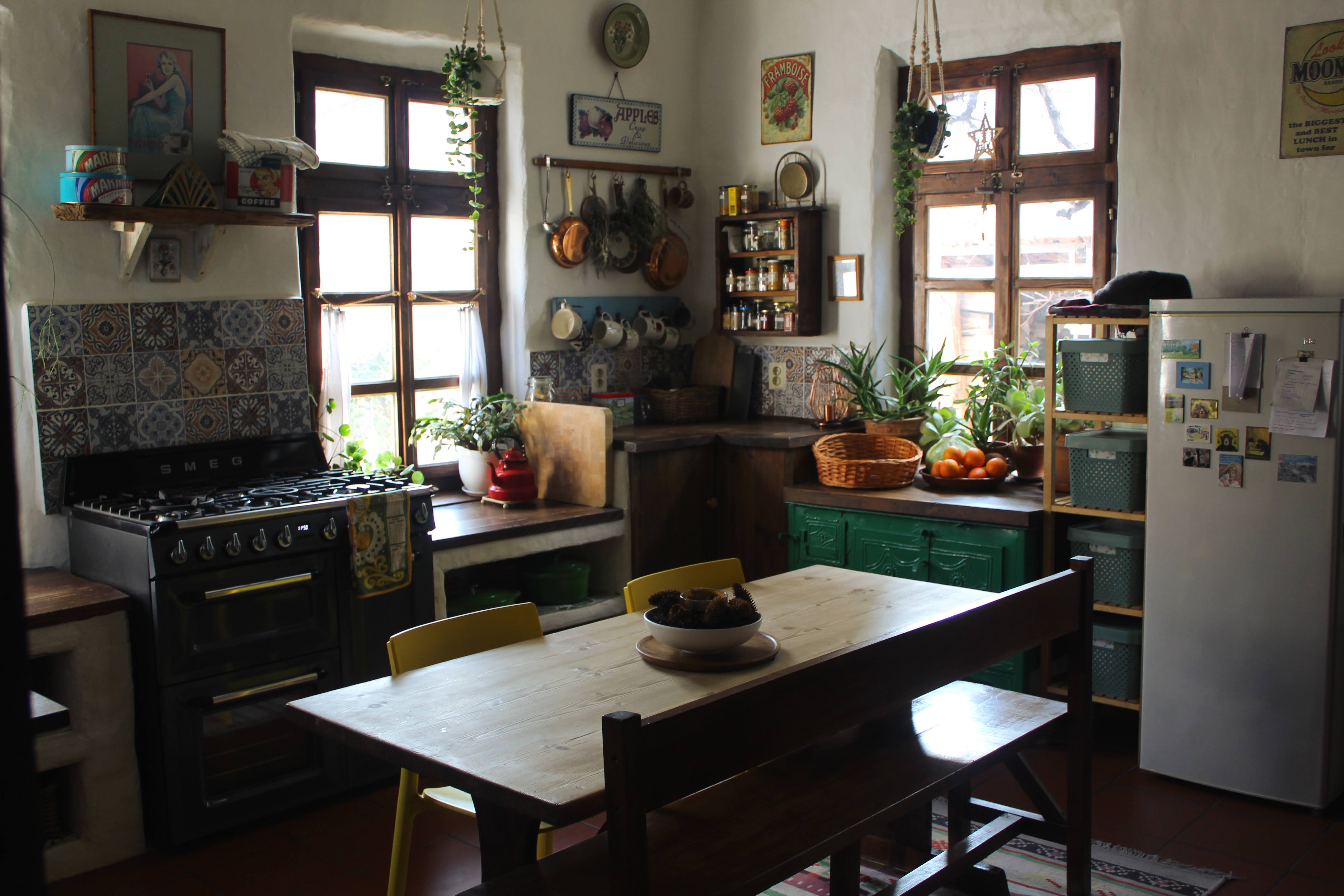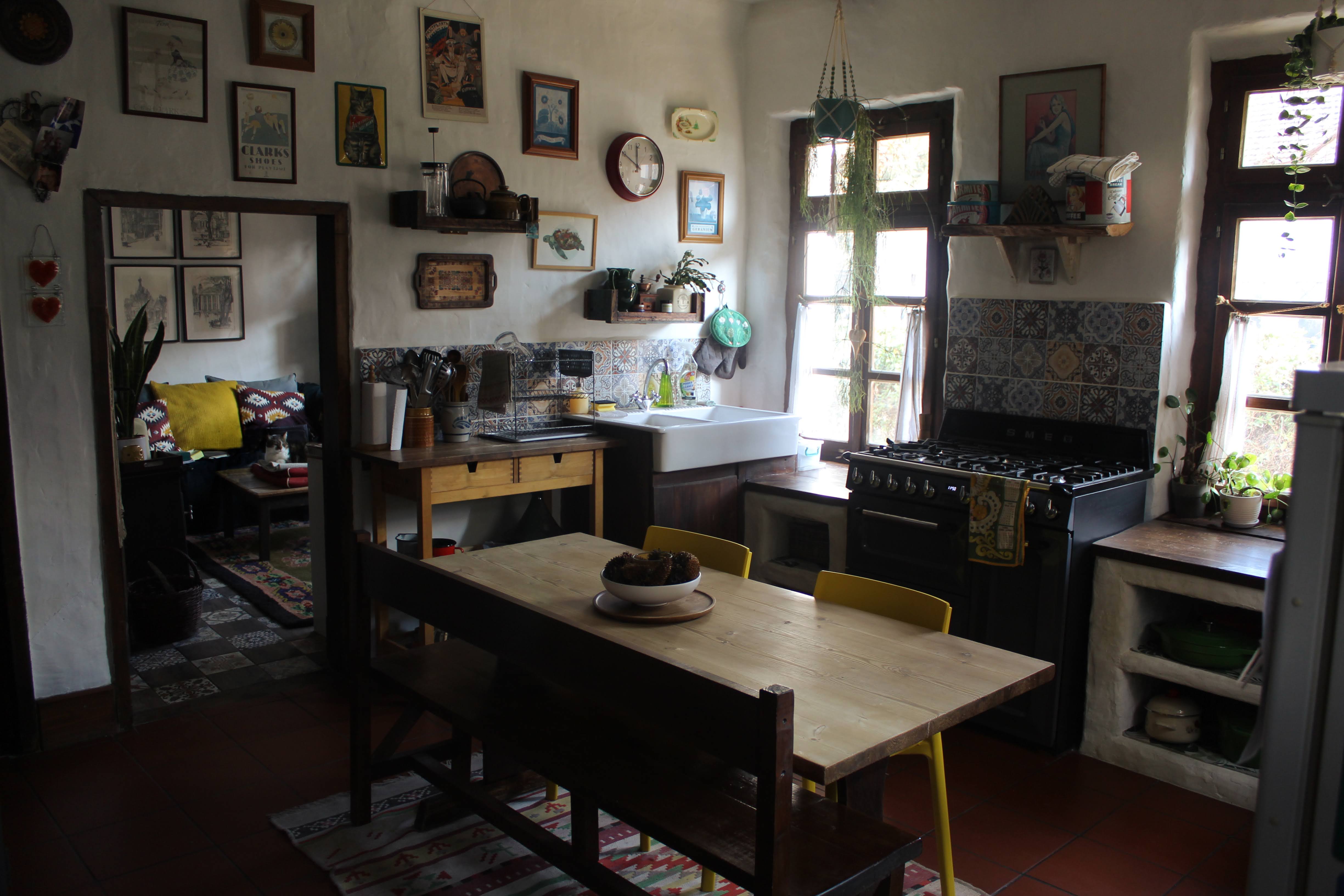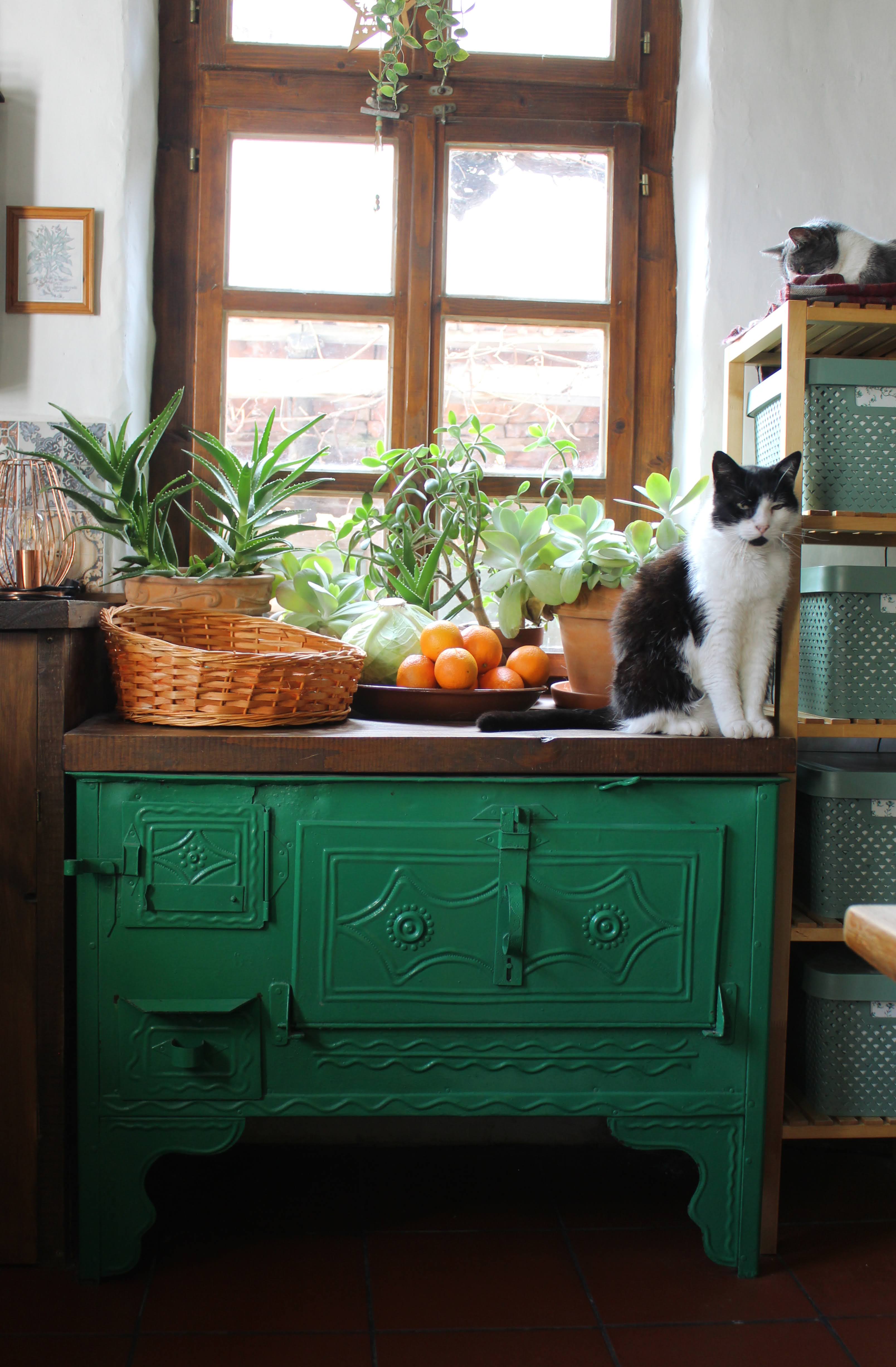The kitchen is the largest, warmest room in our house, and the place we – and the cats – gravitate to every day. With handmade wooden windows, lime plaster walls, wooden counters, oak beams, and a large woodburning stove (that powers the central heating system), it's a rustic space. It’s also quite an awkward space – we have three low windows and four doors (including the front door) all coming off this one room, which left us a bit limited in terms of layout. It’s quirky, but I love it.