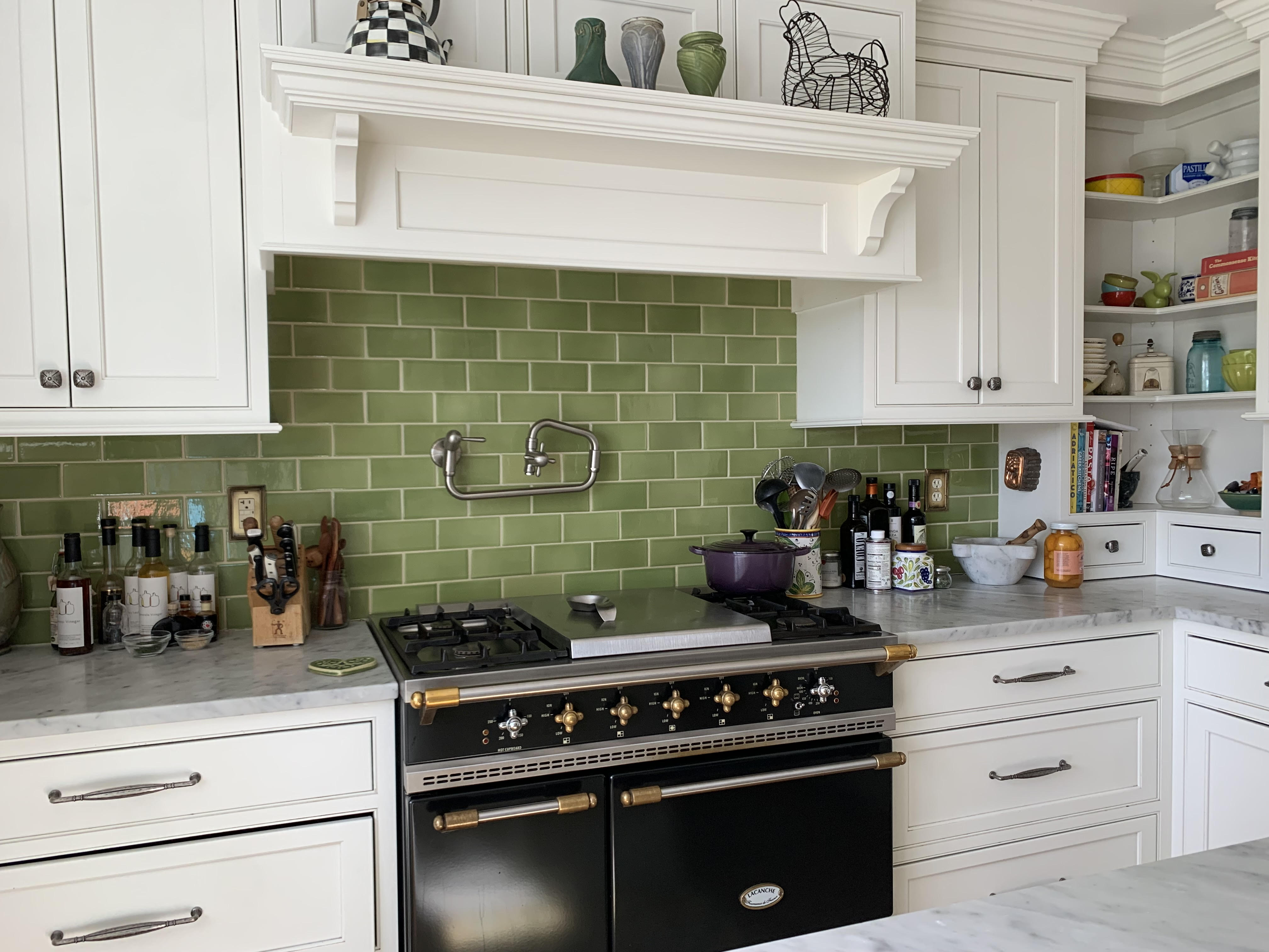 A: My kitchen in Virginia gives the impression of being large because it’s an open space, but it’s actually not that large. It’s the perfect size for me. It’s a U-shaped layout, with an island in the middle, and countertops and appliances (fridge, range, cabinets & drawers, sink) forming the U around the island. We had it redone about a dozen years ago, and though there are some things I would probably change now, I still love it. My great loves are the green tile backsplash and the Lacanche range, which was a splurge but which I use literally every single day.