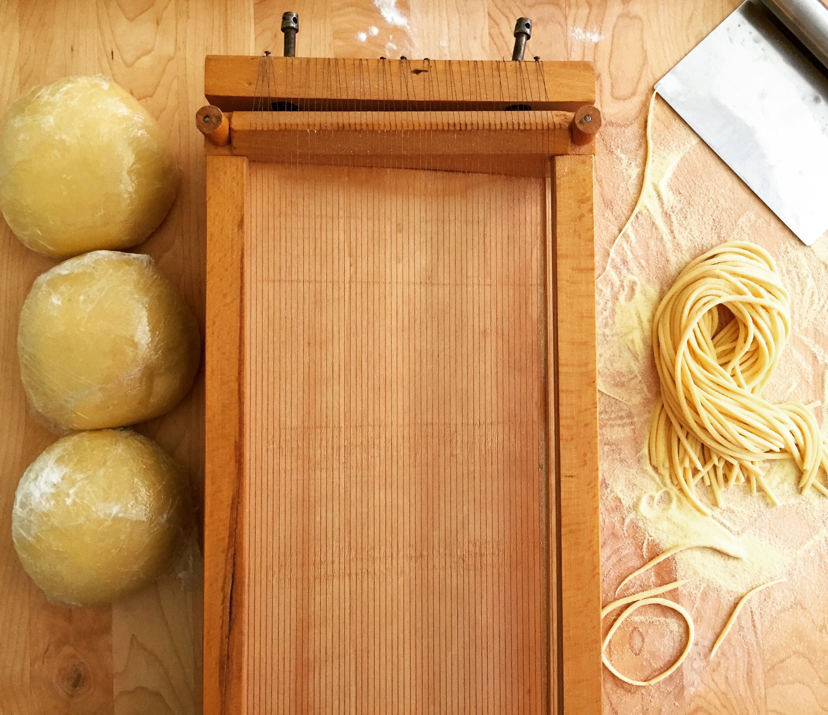 Domenica’s most prized kitchen tool. Her mother’s Chitarra.A: I have several medium and large Le Creuset and Staub Dutch ovens that I use all the time—for soup, sauces, stews and braises, etc. I use a bench scraper for scooping up everything from diced vegetables and doughs to cleaning up spilled wet coffee grounds off the floor (I actually had to do this and it worked perfectly).